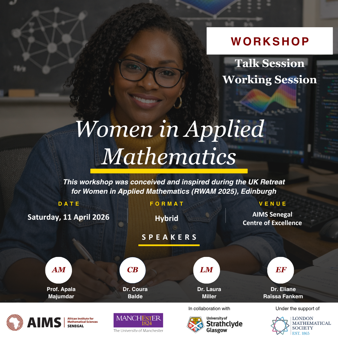 Conceived during the UK Retreat for Women in Applied Mathematics (RWAM 2025), this workshop brings together world-class experts and emerging researchers to foster innovation in STEM. Hosted by AIMS Senegal in collaboration with the University of Manchester, the University of Strathclyde, and the London Mathematical Society, this event is a platform for brilliance, mentorship, and professional growth.